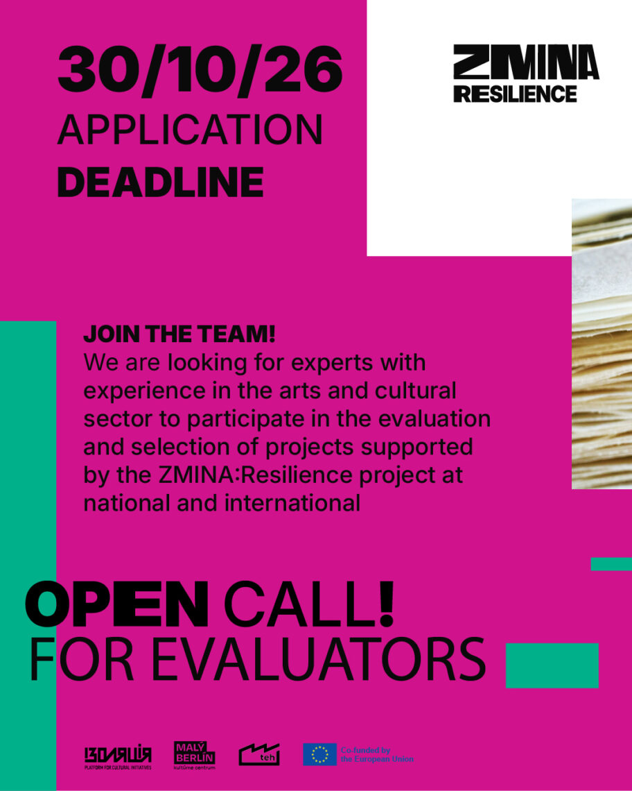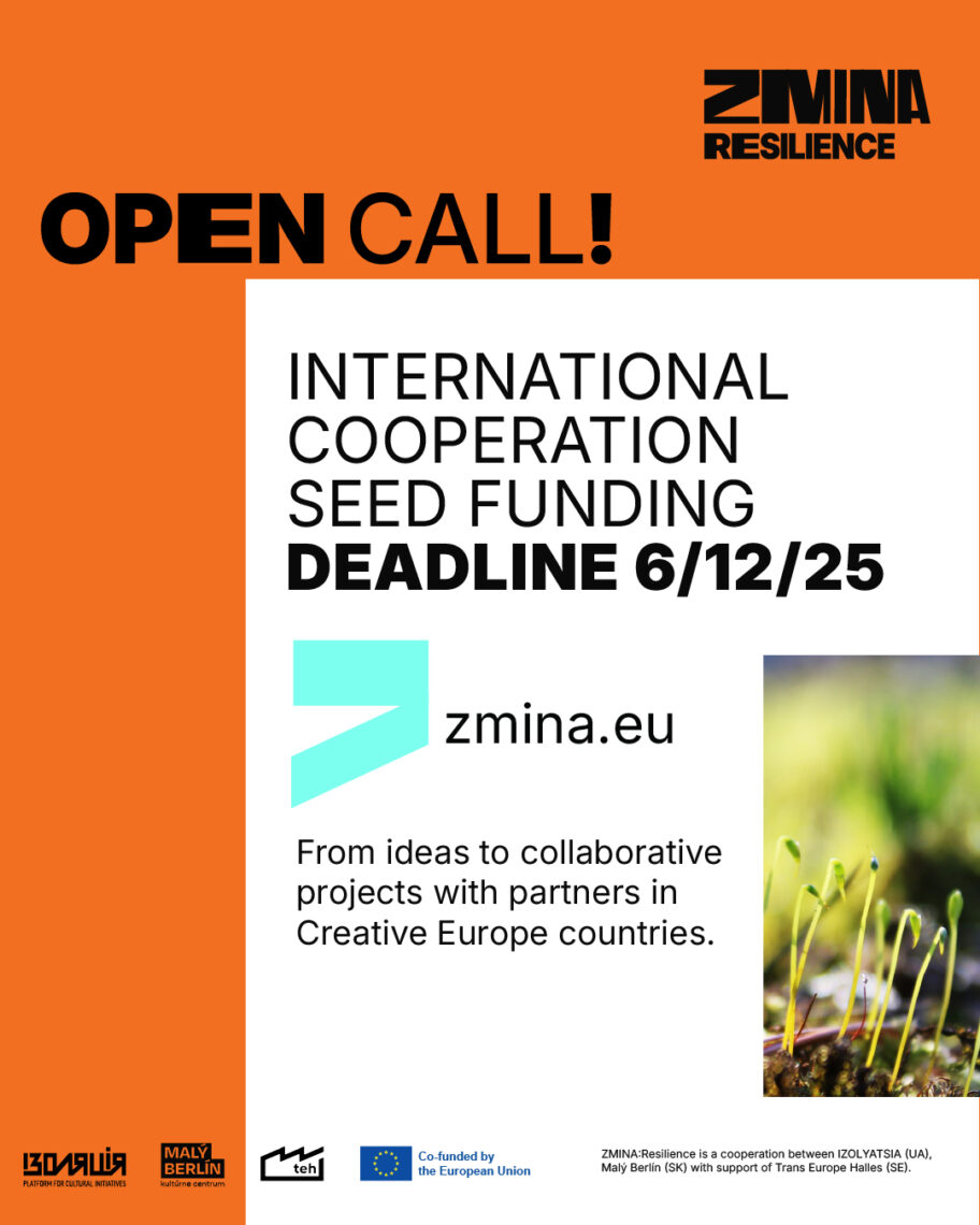 The ZMINA:Resilience project provides support to Ukrainian artistic and cultural organisations to develop project ideas around the theme of resilience into joint project proposals with partners from Creative Europe countries (EU countries, non-EU countries). The aim of this project is to enhance the capacity of Ukrainian organisations for international cooperation, to build equal and sustainable partnerships, to create new cultural, artistic, and creative products, to raise awareness about Ukraine, and to promote Ukraine’s integration into the EU’s cultural landscape.